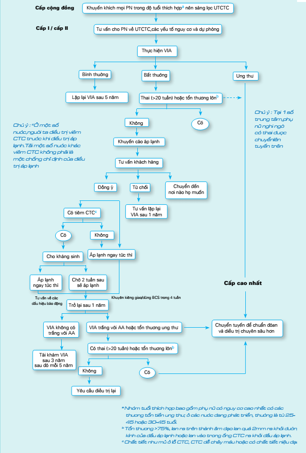3. Các nghiên cứu cho thấy rằng chiến lược hiệu quả nhất cho chương trình phòng chống UTCTC thứ cấp ở những nơi có nguồn lực thấp là chương trình tầm soát sử dụng hoặc là xét nghiệm HPV DNA hoặc là phương pháp quan sát cổ tử cung với acid acetic VIA (Visual Inspection with Acid acetic VIA), sau đó điều trị tổn thương tiền UTCTC bằng sử dụng phương pháp áp lạnh (freezing). Quan điểm này đạt được mục tiêu “Khám và điều trị một lần” (sử dụng VIA và áp lạnh), có thể được tiến hành bởi bác sĩ / nữ hộ sinh / y tá đã được đào tạo.